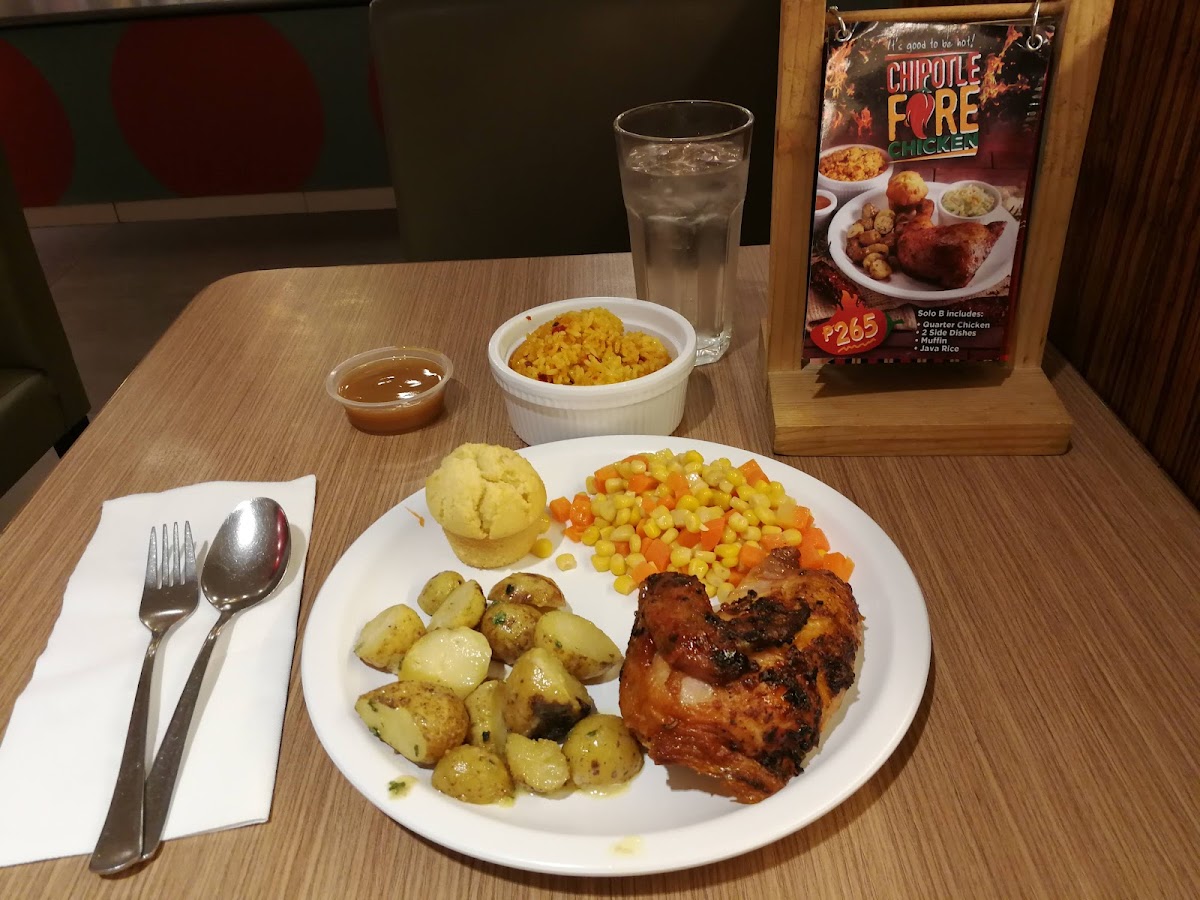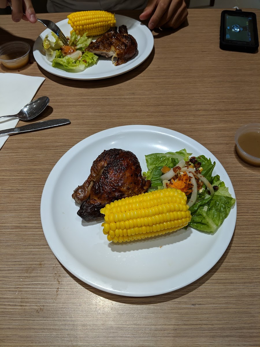 Quarter roasted chicken served with corn & carrots, caesar salad, and a drink. 35g Fiber (138% REI/RNI) verified by SGS Philippines.