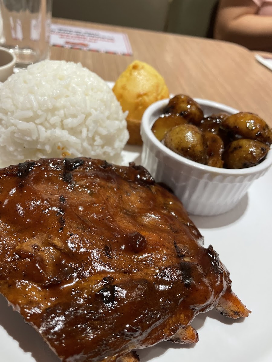 Ribs and quarter roasted chicken infused with garlic and citrus flavors. Served with chimichurri sauce, 2 side dishes, and muffin.
