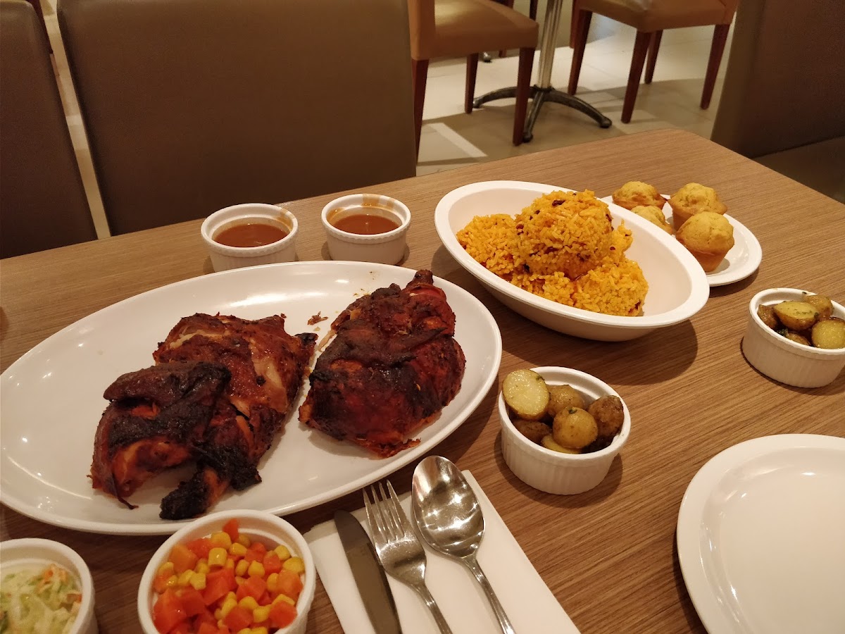 Half Classic Roasted Chicken & 2 Half Slab Ribs with 4 Regular Side Dishes, 4 Muffins & 4 Rice and 1.5L Soda or 4 Minute Maid bottles.